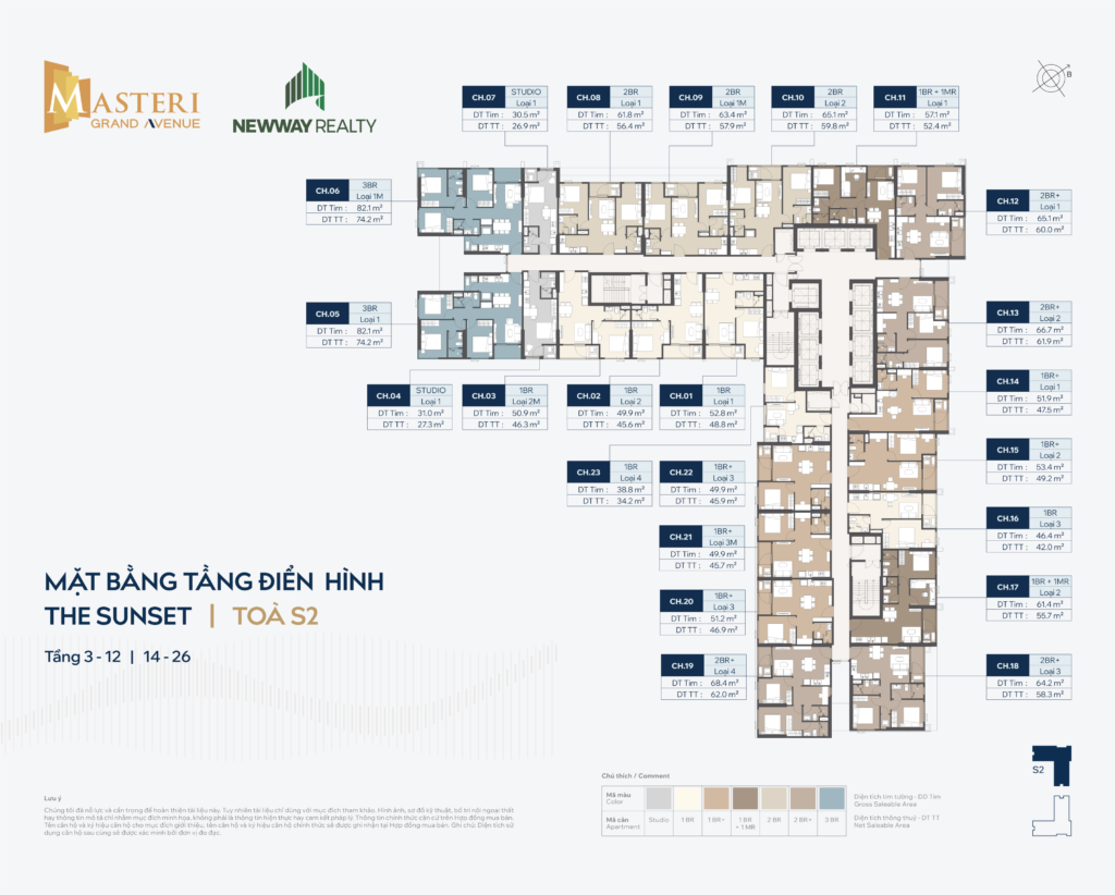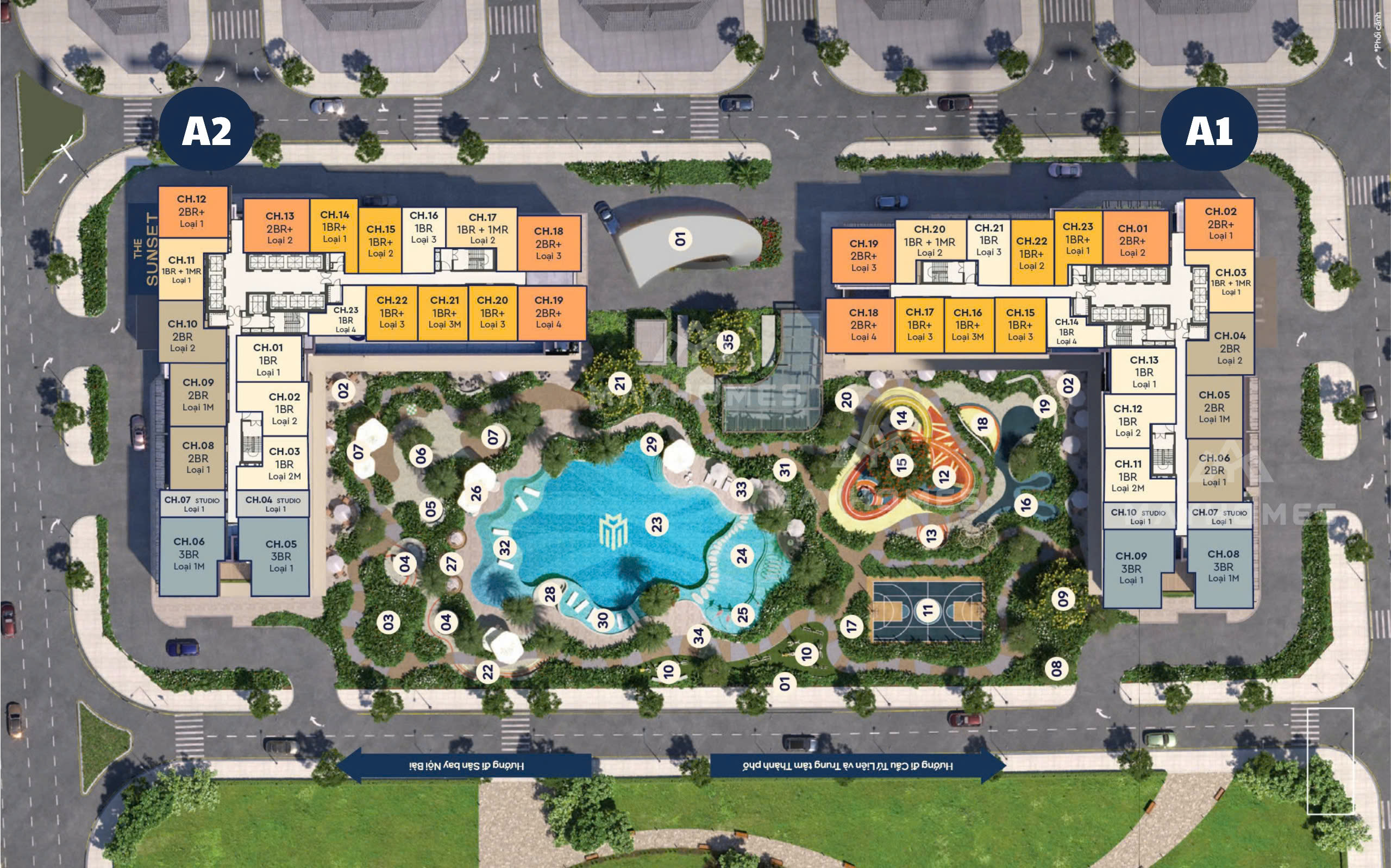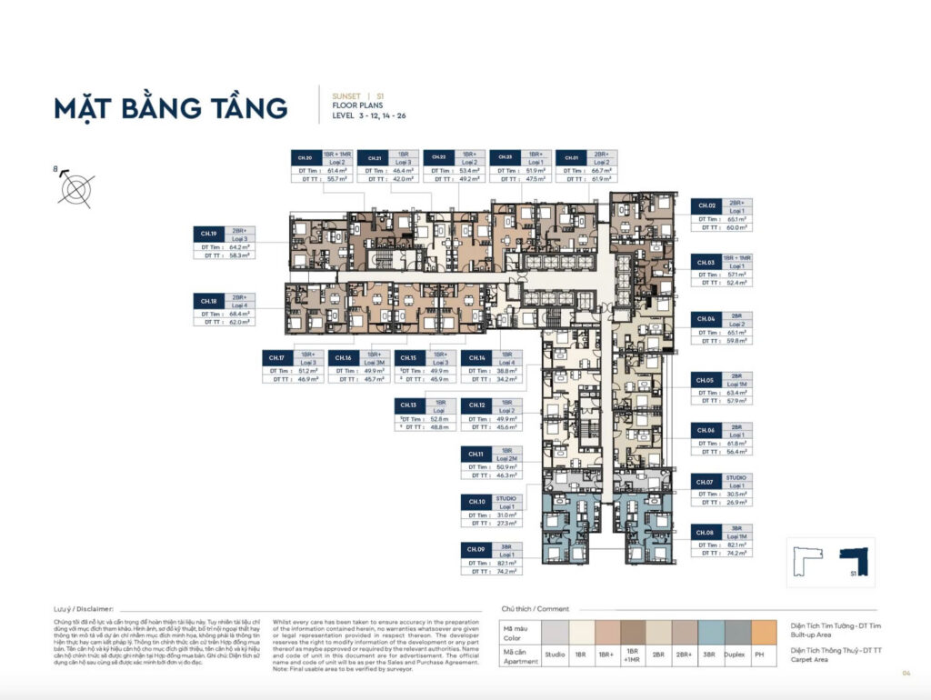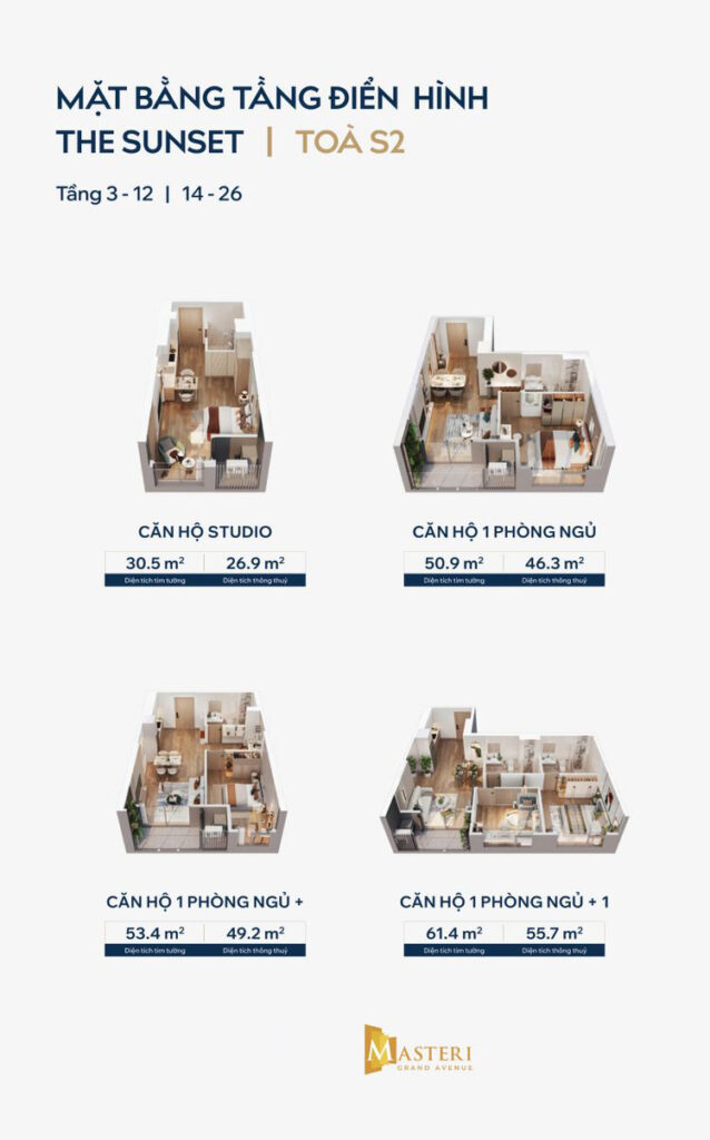 • Loại hình căn hộ: Studio, 1PN, 1PN+1, 2PN, 2PN+1, 3PN, Duplex, Penthouse